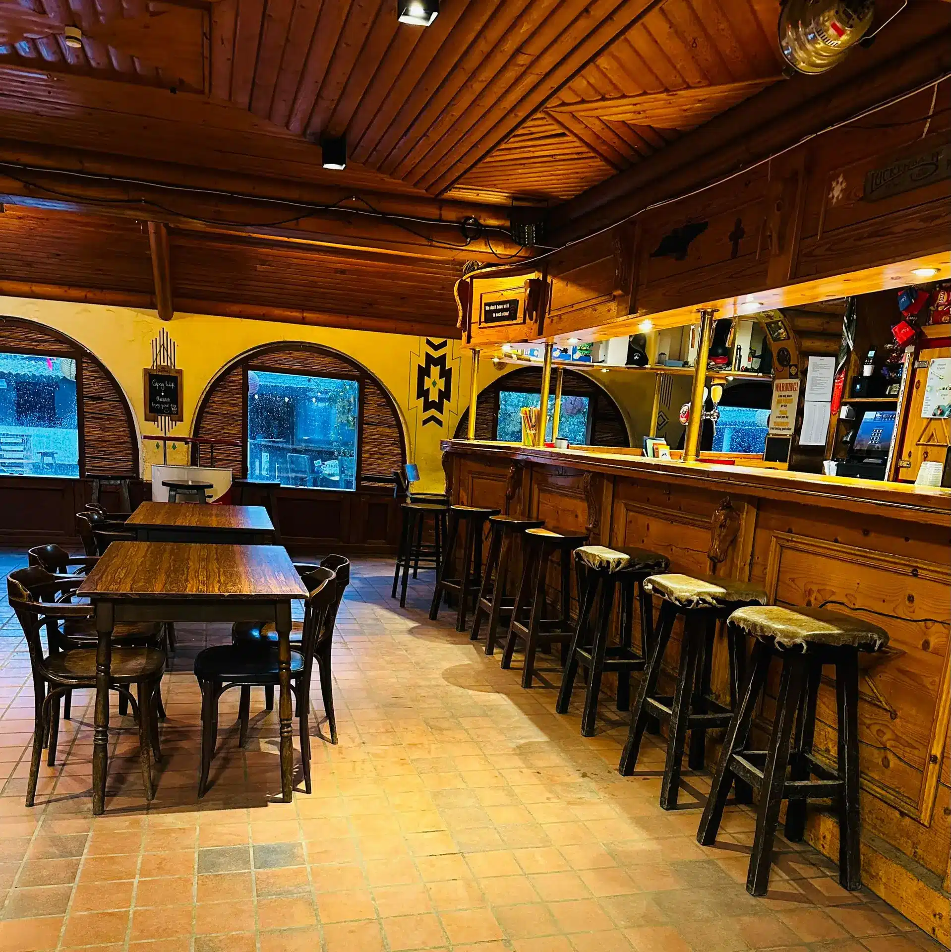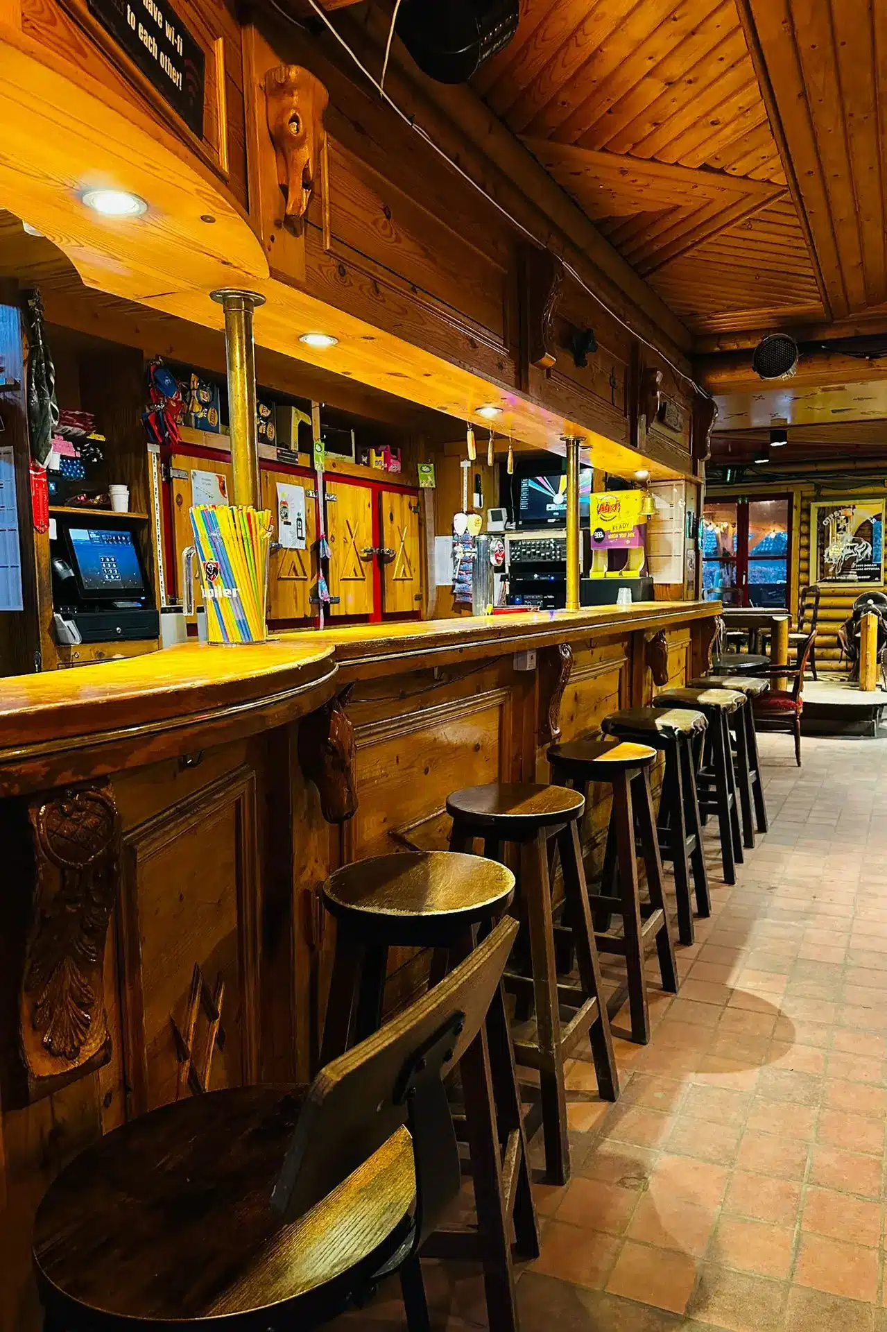 Stap binnen in onze ranch-saloon, waar de sfeer even warm is als het kampvuur buiten. Of je nu graag een praatje slaat aan de toog, of liever neerstrijkt bij het knisperende vuur, je vindt altijd een plek om even tot rust te komen na het rijden.